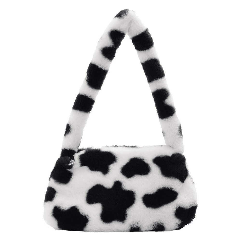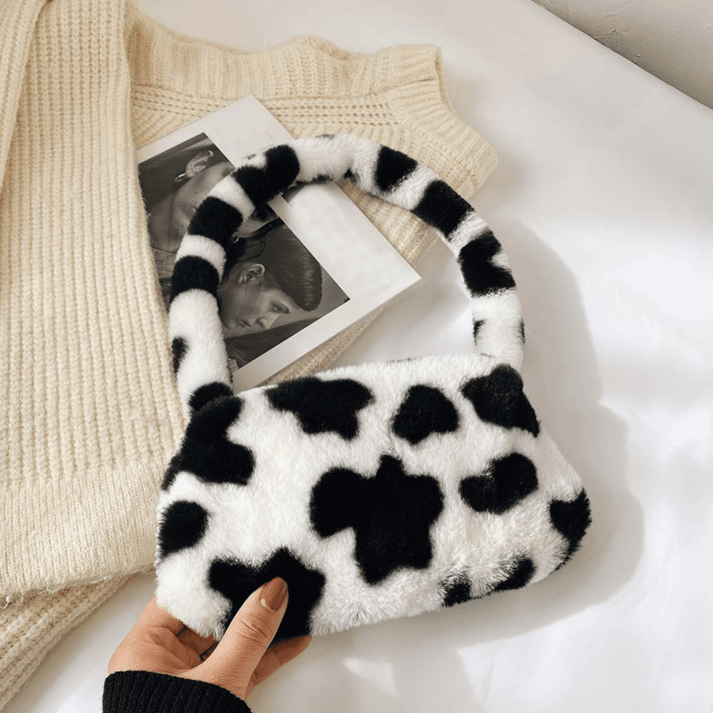 This faux fur bag is made of lightweight materials, has a polyester lining, and is super soft.