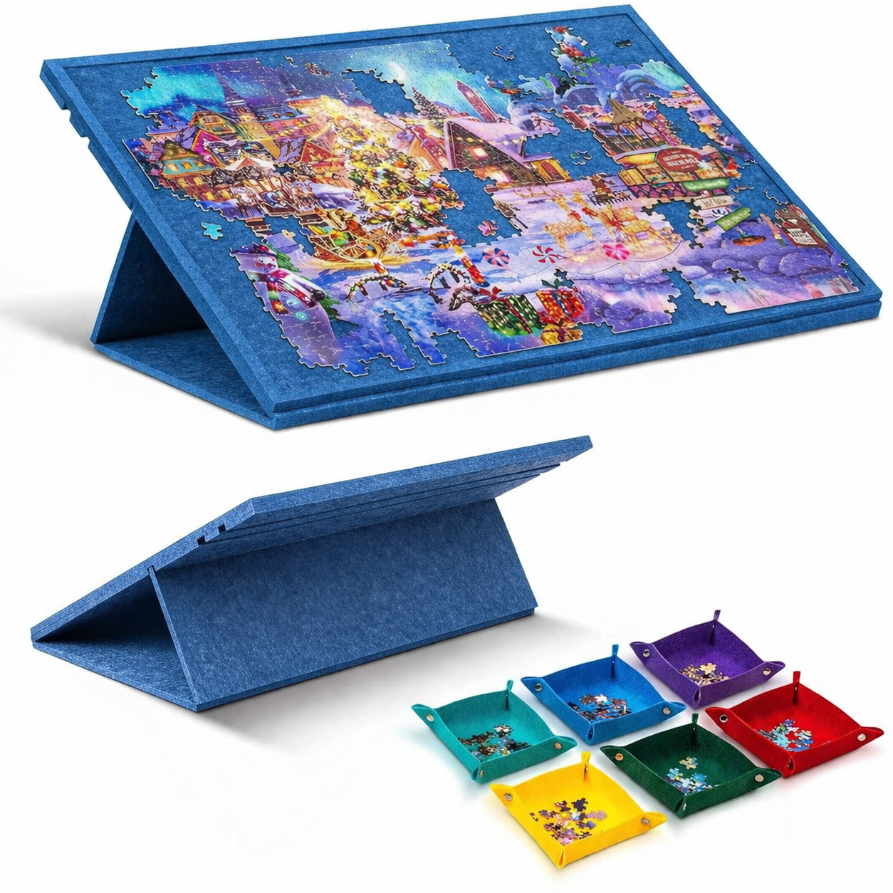 Lightweight puzzle board is a portable, space-saving with adjustable angles, a non-slip felt surface, six sorting trays, and a smart 2-in-1 cover and stand, it keeps your puzzle organized, protected, and ready to enjoy anytime—perfect for up to 1000-piece puzzles.