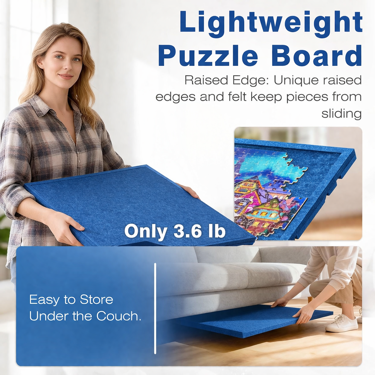 With a spacious working area of 29.92″ × 20.08″ (76 × 51 cm), this board is ideal for most 1000-piece puzzles. Its slim, lightweight design allows for easy storage under a sofa or bed—perfect for saving space while keeping your puzzle intact.